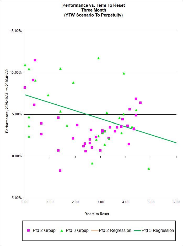 … and the three-month returns vs. Term to Reset, show no correlation for the Pfd-2 Group but a small one (13%) for the Pfd-3 Group:
