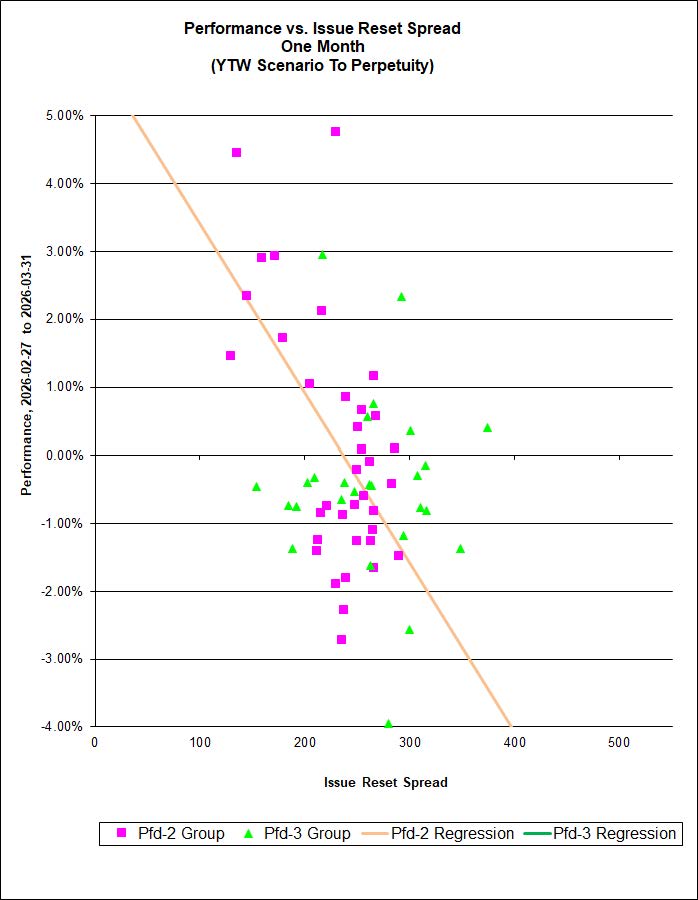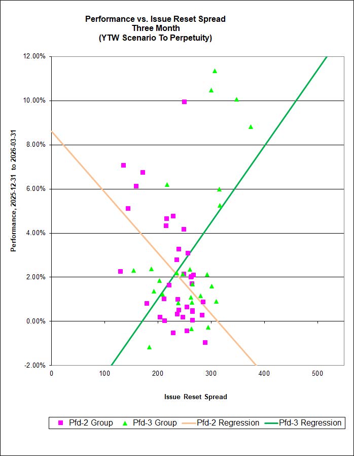 There is a good correlations between the Issue Reset Spread and 1-month performance for discounted FixedResets for the Pfd-2 Group (31%) but not for for Pfd-3 Group issues.