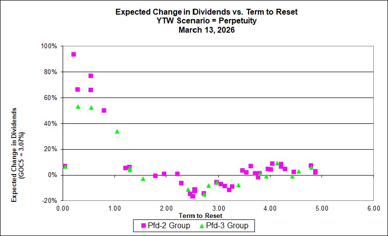 The situation with FixedResets is interesting, with the spread between GOC-5 and the interest-adjusted FixedReset (Discount) rate widening significantly (despite recent narrowing) from its 2021-11-10 low of 344bp to a level of 491bp (as of 2026-4-1)… (chart end-date 2026-03-13):